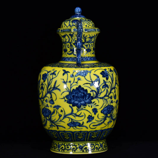 A0054 Chinese Yellow Glaze Blue And White Porcelain Lotus Flower Design Double Ears Pot