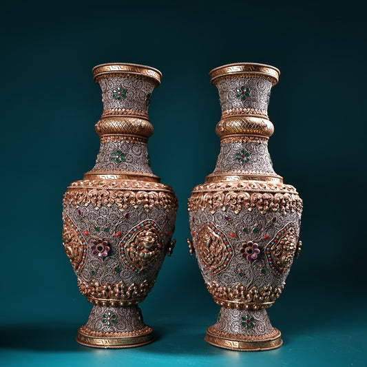 A0057 A Pair Tibetan Copper Inlay Gilt Gold Silver Wires & Gem Flower Design Vases