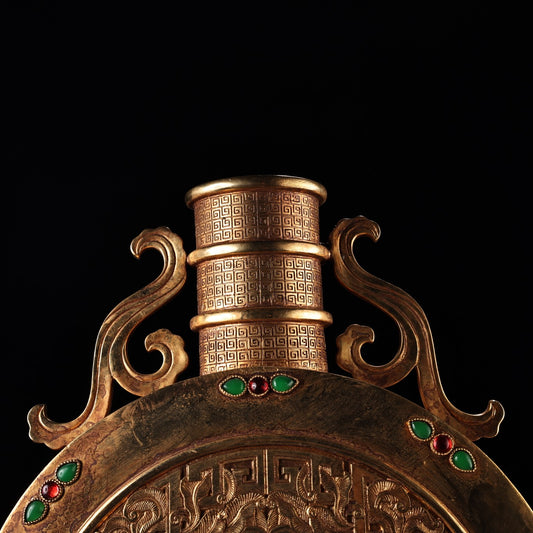 A0070 Vintage Chinese Gilt Gold Copper Inlay Gem Double Ears Vase