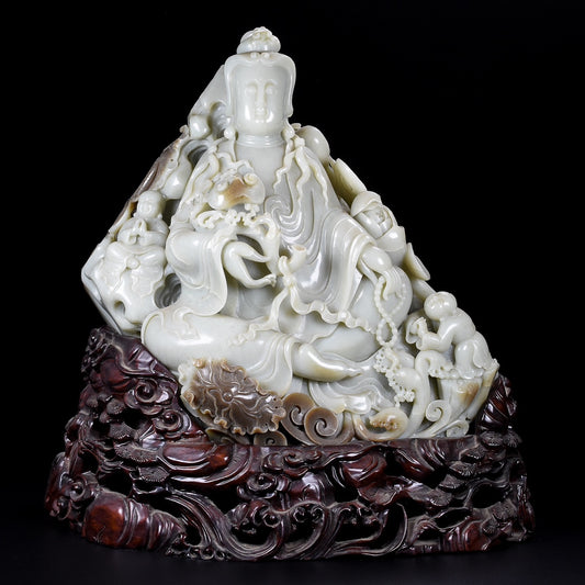 A0074 High Quality Chinese Natural Hetian Jade Carved Ruyi Kwan-yin & Kid Statue