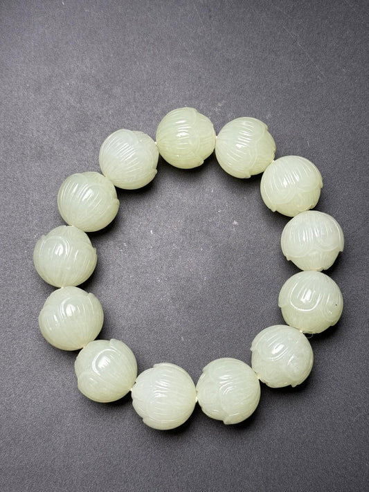 A0653 18mm Superb Chinese White Hetian Jade Carved Lotus Flower Beads Bracelet