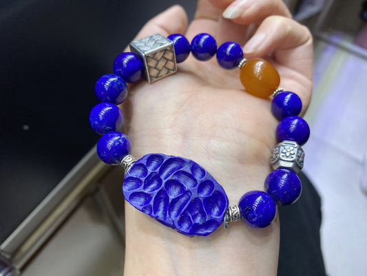 A1888 Chinese 925 Silver Inlay Lapis Lazuli & Beeswax Beads Bracelet