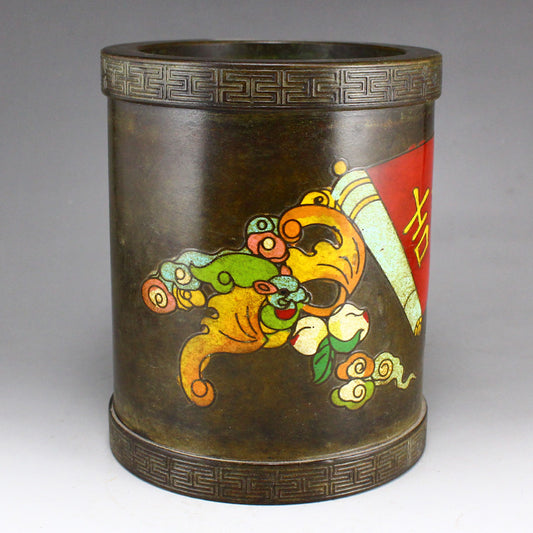 Chinese Bronze Enamel Fortune Bat & Peach Brush Pot