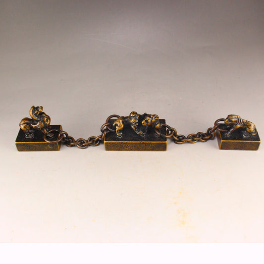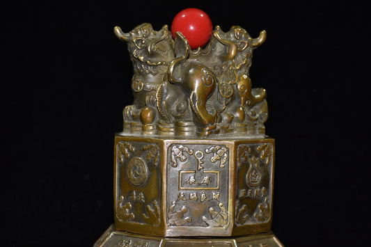 Chinese Brass Inlay Gem Lucky Lion Seal w Base
