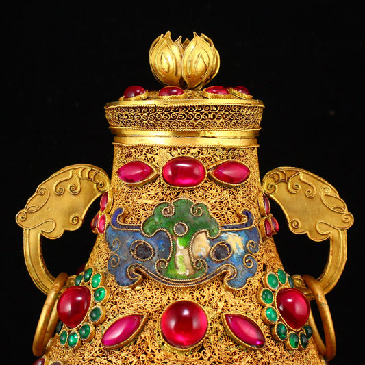 Superb Chinese Gold Wire Enamel Inlay Gem Double Rings Pot w Lid