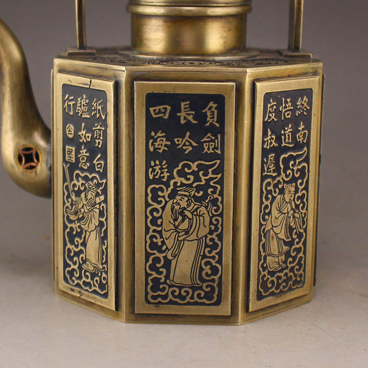 Chinese White Copper Poetic Prose & Figures Handle Teapot