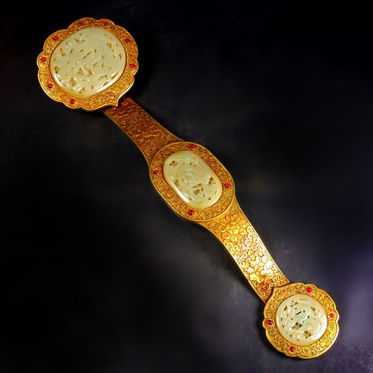 A1771 Chinese Gilt Gold Copper Inlay Hetian Jade & Gems Ruyi Scepter Statue
