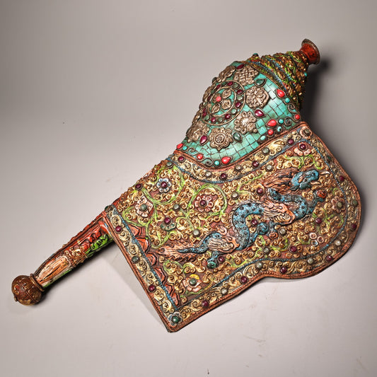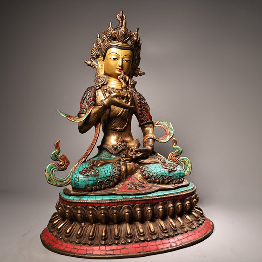 A1859 Tibetan Buddhism Gilt Gold Copper Inlay Turquoise & Gems Concha Statue