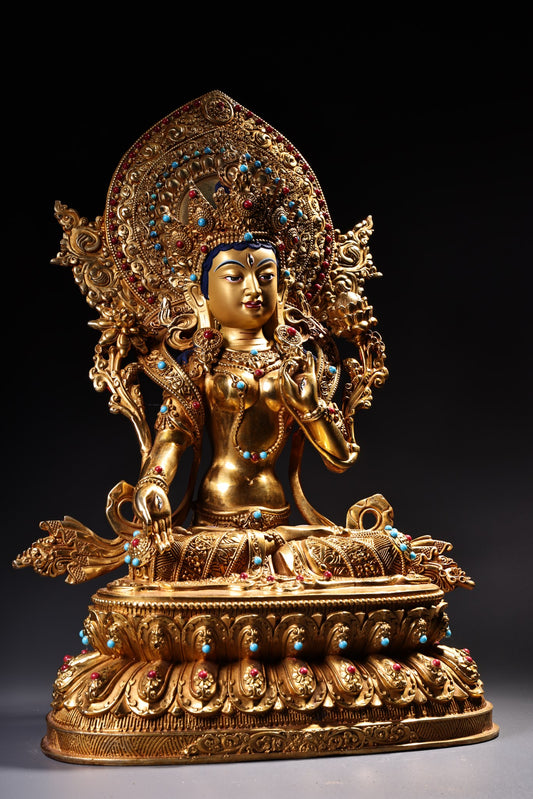 A1839 Tibetan Buddhism Gilt Gold Copper Inlay Gems Tara Statue