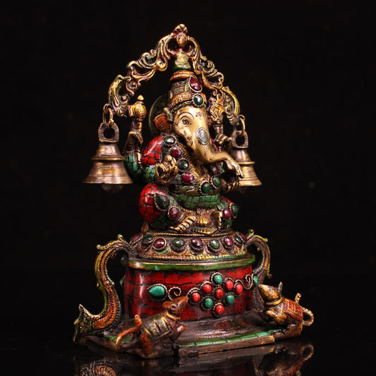 A1865 Tibetan Buddhism Gilt Gold Copper Inlay Turquoise & Gems Ganesha Buddha Statue