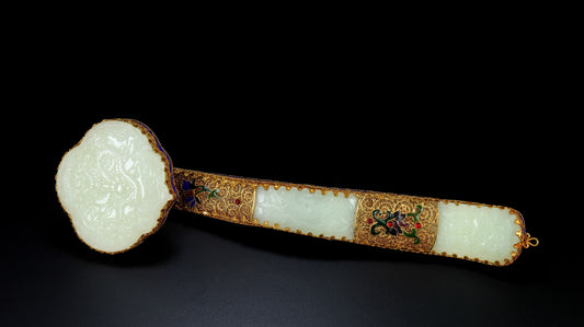 A1938 Exquisite Chinese Gold Wires Enamel Inlay Hetian Jade Ruyi Scepter Statue