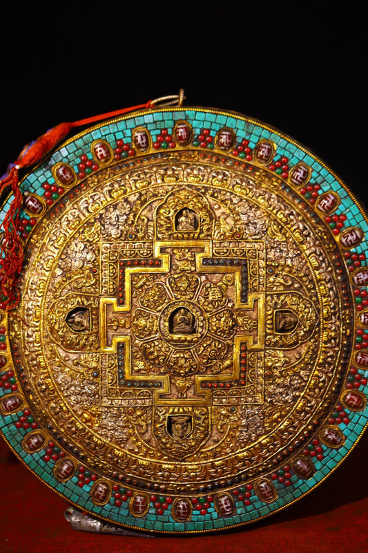 A1122 Tibetan Silver Plated Gilt Gold Inlay Turquoise & DZI Agate & Gems Tangka