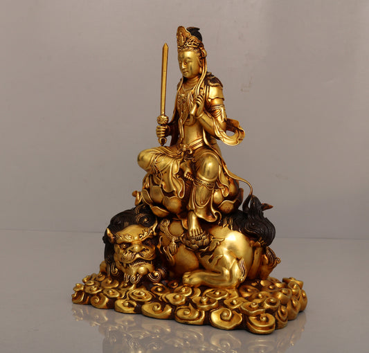 A1132 Vintage Chinese Gilt Gold Copper Manjushri Bodhisattva Statue