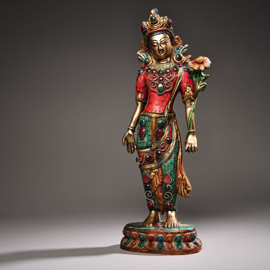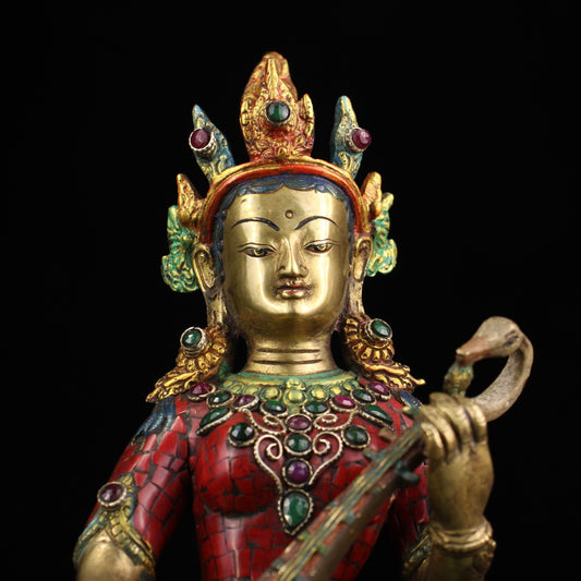 A1168 Tibetan Buddhism Gilt Gold Copper Inlay Turquoise & Gems Miaoyin Tianmu Statue
