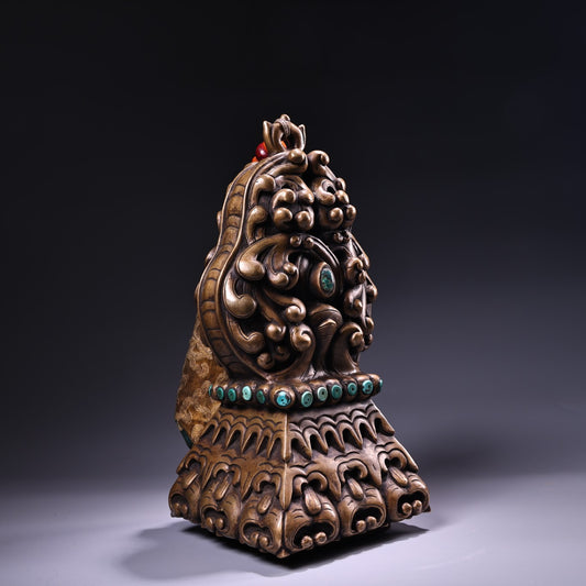 A1150 Vintage Chinese Gilt Gold Copper Inlay Turquoise Seal