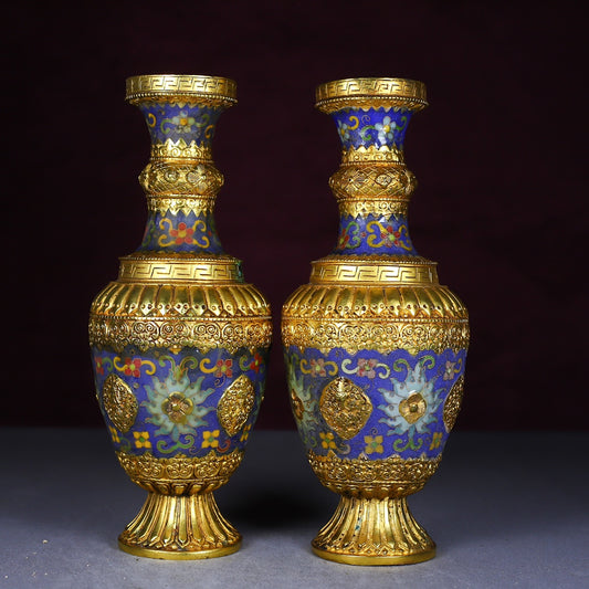 A1153 A Pair Vintage Chinese Gilt Gold Copper Cloisonne Vase