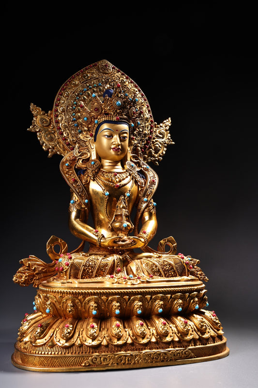 A1158 Tibetan Buddhism Gilt Gold Copper Inlay Gems Amitayus Statue