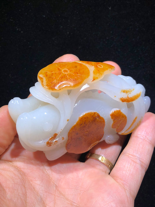 A0196 Superb Chinese Hetian Jade Carved Fish & Lotus Leaf Statue