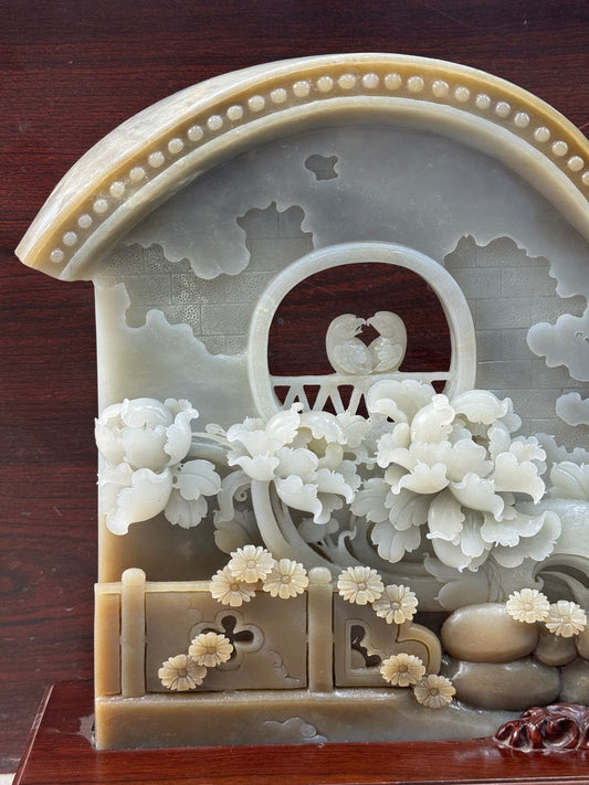 A0207 High Quality Chinese Natural Hetian Jade Carved Peony & Bird Screen