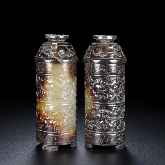 A0234 A Pair Vintage Chinese Hetian Jade Low Relief Figure & Beast Design Incense Tube