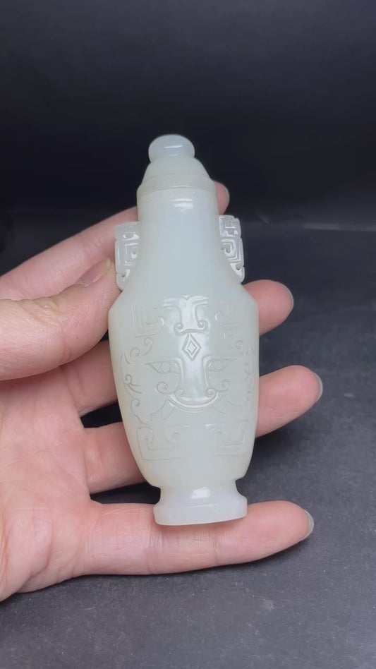 A0277 Old Chinese White Hetian Jade Carved Beast Face Design Bottle