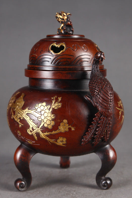 A0858 Vintage Chinese Gilt Gold Copper Double Ears Peacock Plum Flower & Magpie Design Incense Burner