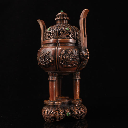 A0939 Vintage Chinese Copper Inlay Green Jade Flowers Design Incense Burner