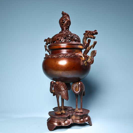 A1007 Vintage Chinese Copper Double Ears Fortune Dragon & Crane Incense Burner