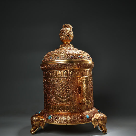 A1115 Vintage Chinese Gilt Gold Copper Inlay Gems Double Ear Incense Burner