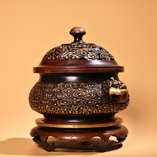A0988 Vintage Chinese Copper Inlay Gem Fortune Lion & Lotus Flower Incense Burner