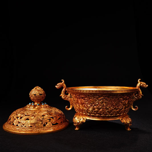 A0970 Vintage Chinese Gilt Gold Copper Incense Burner