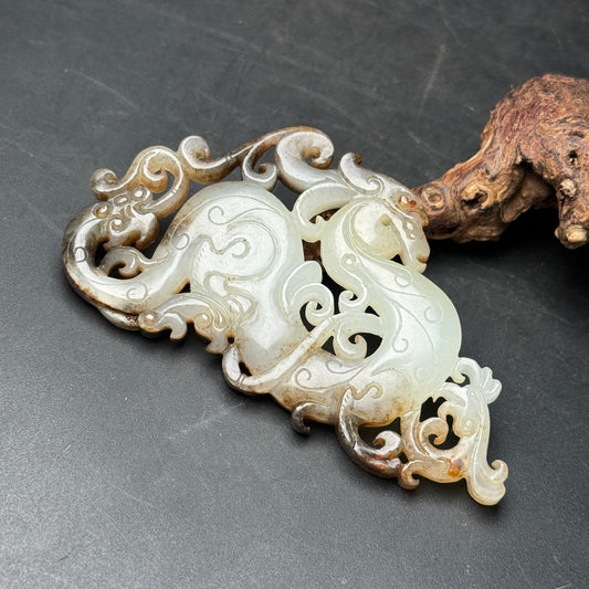 A0227 Vintage Openwork Chinese Hetian Jade Carved Dragon Phoenix Pendant