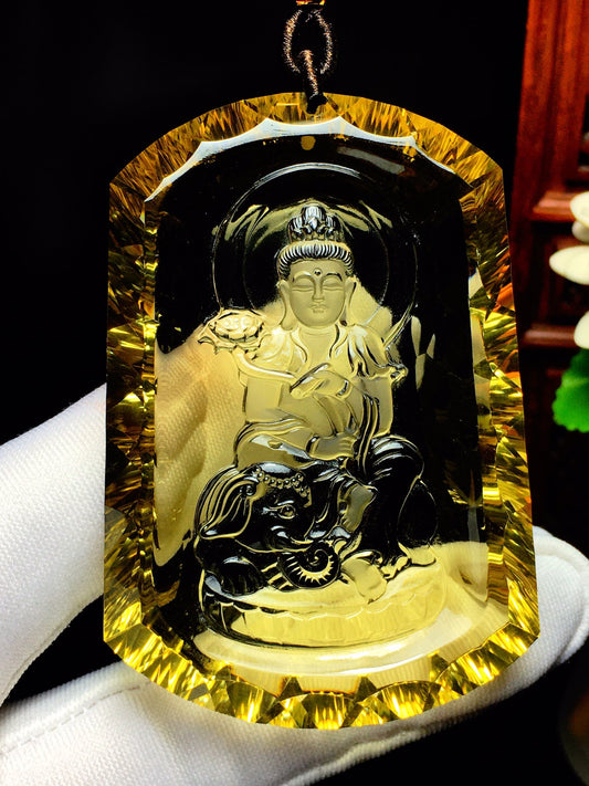 A0237 Natural Yellow Crystal Carved Samantabhadra Bodhisattva Pendant