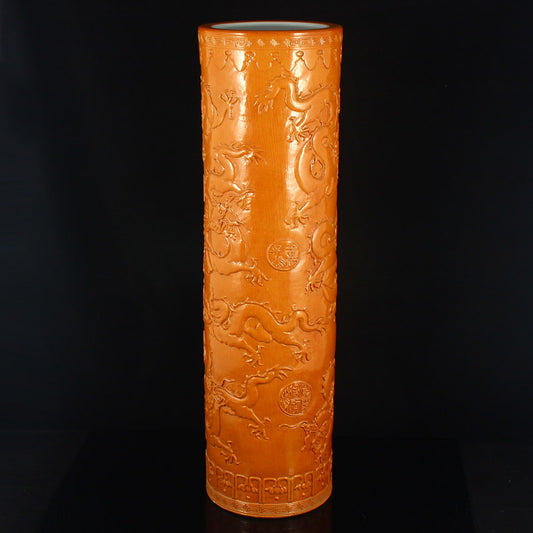 Chinese Yellow Glaze Low Relief Fortune Dragon Porcelain Painting Pot