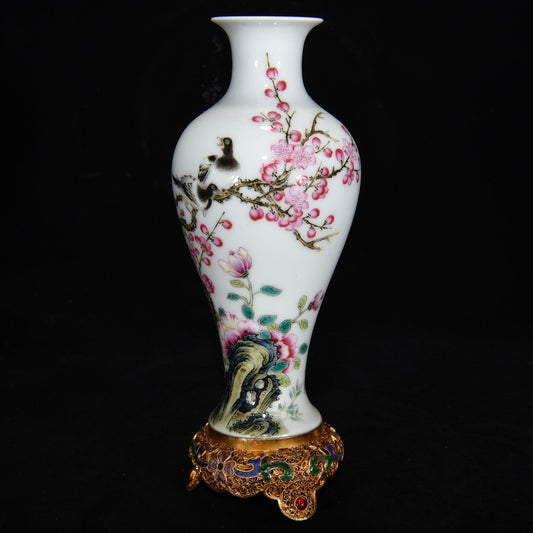 Chinese Famille Rose Flower Design Porcelain Vase W Gold Wires Enamel Inlay Red Coral & Gem Base