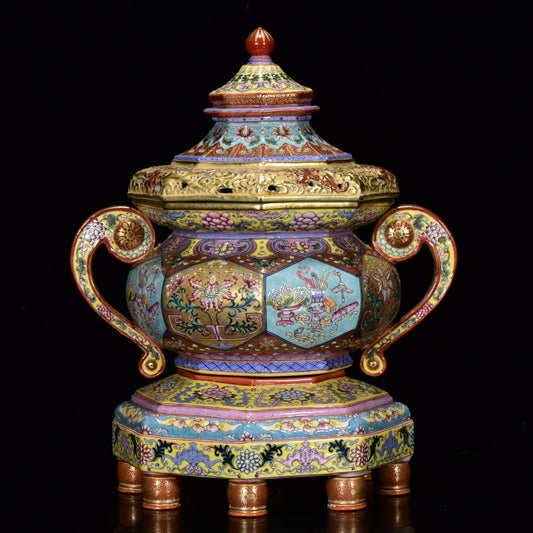 A1824 Chinese Qing Dynasty Gilt Gold Famille Rose Enamel Flowers Design Porcelain Incense Burner