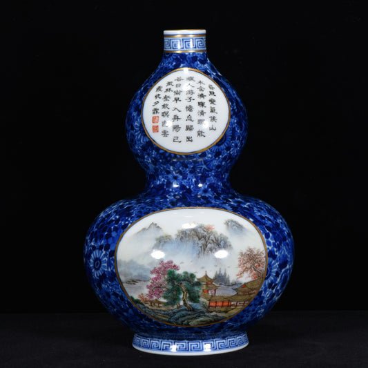 A1863 Chinese Qing Dynasty Gilt Edge Blue And White + Famille Rose Live In Remote Mountains Design Porcelain Vase
