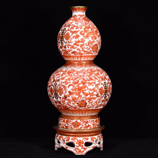 A1916 Chinese Qing Dynasty Gilt Edge Iron Red Glaze Flowers Design Gourd Shape Turn Heart Porcelain Vase