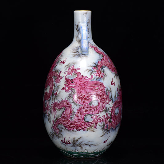 A1923 Chinese Qing Dynasty Gilt Edge Rouge Red Glaze Fortune Dragon Design Porcelain Vase