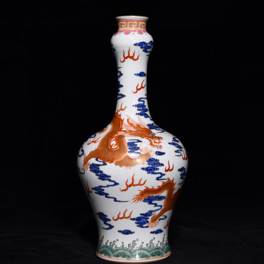 A2084 Chinese Gilt Edge Iron Red Glaze + Blue And White Porcelain Clouds Dragon Design Porcelain Vase