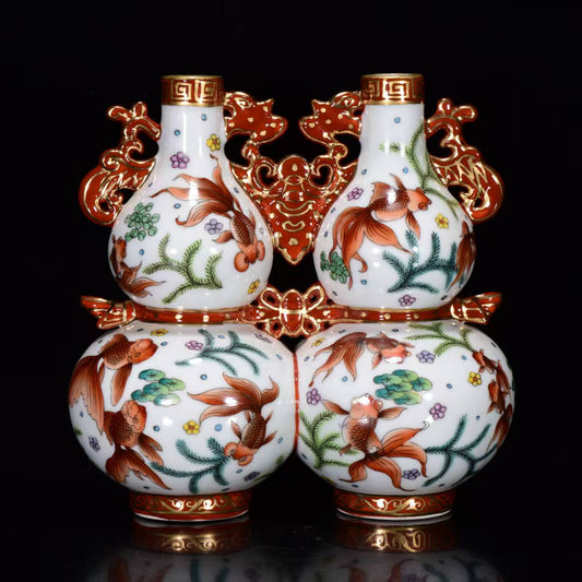 A2095 Chinese Gilt Edge Famille Rose Conjoined Gourd Shape Porcelain Vase