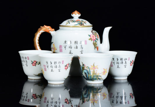 A2103 A Set Chinese Gilt Edge Famille Rose Pomegranate & Bird Design Porcelain Teapot & Cups