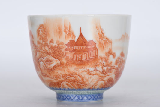 A1770 A Pair Chinese Iron Red Glaze Live In Remote Mountains Design Porcelain Cups