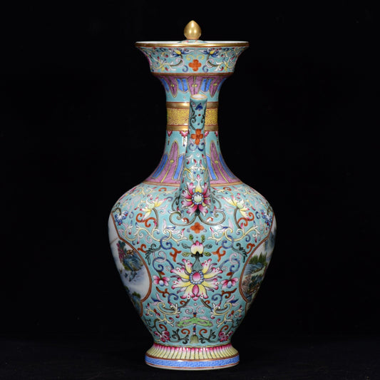 A1802 Chinese Qing Dynasty Gilt Edge Famille Rose Mountain River Scene Design Porcelain Wine Pot