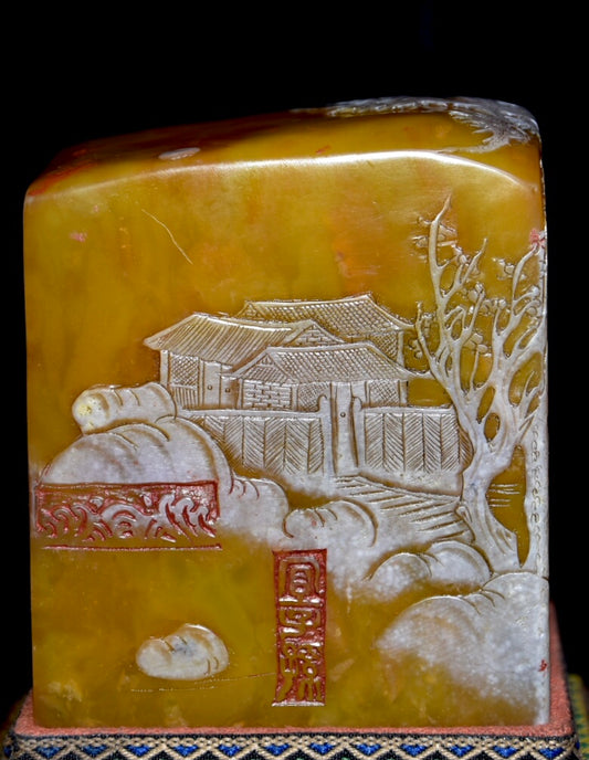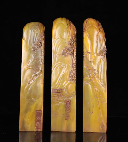 A1402 A Set Three Chinese Shoushan Tianhuang Stone Low Relief Pine Tree & Figure Seal