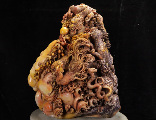 A1579 Super Old Chinese Shoushan Stone Carved Four Divine Beast Statue