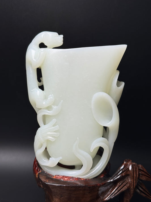 A0323 Superb Chinese Natural Hetian Jade Carved Chi Dragon Wine Cup