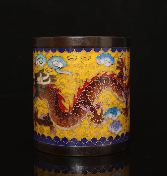 A0333 Vintage Chinese Bronze Cloisonne Fortune Dragon Design Brush Pot