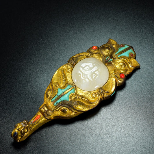 A0412 Vintage Chinese Gilt Gold Bronze Inlay Hetian Jade & Turquoise Dragon Belt Buckle