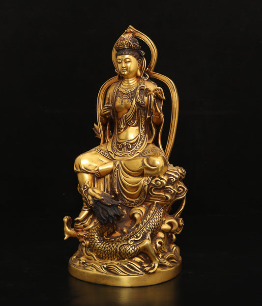 A0039 Vintage Chinese Gilt Gold Copper Kwan-yin & Fortune Dragon Statue